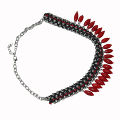This piece has a black beaded chain from which long, oval shaped red beads hang. This is a chunky necklace that will add pizzazz to your everyday outfits.This necklace has been created by combining Steel Chain, Cotton chord, Red Glass Beads to give it an ethnic look and feel. Wear it over a dark color or light colored dress and...