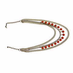 Zarood Drops of Red Necklace A multi-stranded golden colored necklace exquisitely handcrafted is eye catching. The lipstick red sensual beads on the middle strand will ensure that you do not lack attention and praise. The contrast of the luscious red and magnetic gold makes this piece truly unique and special. It softly whispers sultry, tantalizing and tempting without you even...