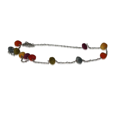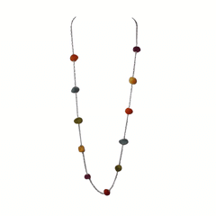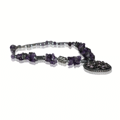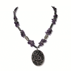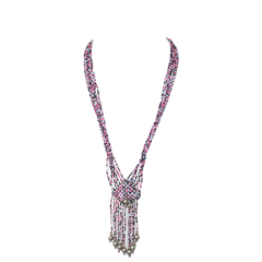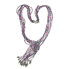 This groovy piece is very unique with multiple beaded strands of a combination of black, pink and blue beads. The center piece or pendant has been created by the crisscross of the beaded chains and a couple of Strings of the beads. At the edge of each string is a small metal bead. The Zarood Psychedelic Necklace is bonhomie of...