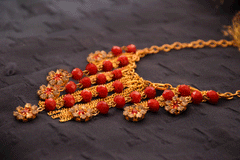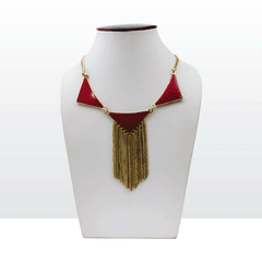 Luscious and tantalizing red accentuates the otherwise simple geometrical design. This straight cut design is further offset by the delicately feminine design of the golden colored chains that give the appearance of a tiny waterfall. The chain design is matched in the clasp that goes to the back of your neck to bring a certain harmony. Handcrafted with care this...
