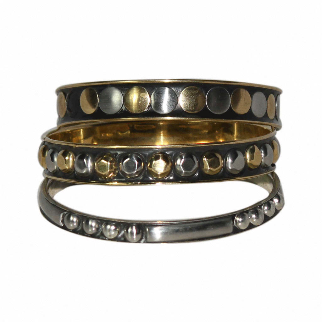 There is sense in simplicity – aptly conveyed by this stylish yet simple bracelet. It brings to the fore the focus of the artisan on simple taste that speaks volumes. The two-tone appeal is accentuated by the studs in the same tones. The simple rounded design gets a lift with the bold studs making this accessory truly standout. If you are among the people who enjoy mixing up their jewelry wardrobe, you will love this two-tone handcrafted beauty. It is sure to add visual interest to any ensemble and also complement the shades that are prevalent in your clothing wardrobe. No anxious moments will be spent on wondering if it matches your skin tone as this two-tone will match all. Fashion nowadays has changed and so mix and match in different colored metals is certainly in. And two-tone accessories with silver and gold tones help tie the outfit together.