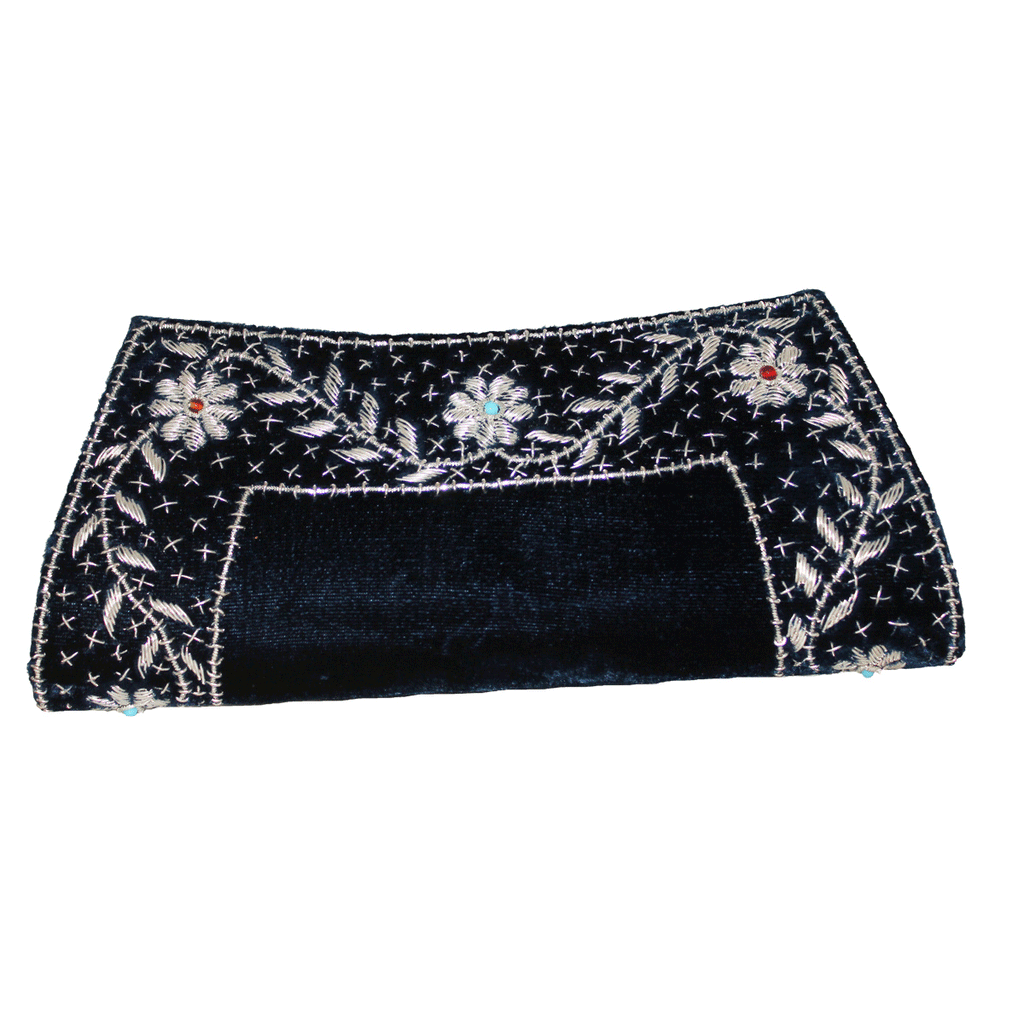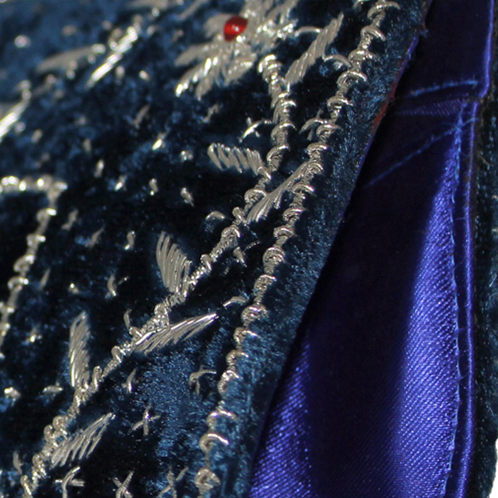 Created on a blue velvet base with silver thread vines running at the border, this clutch has a royalty status.