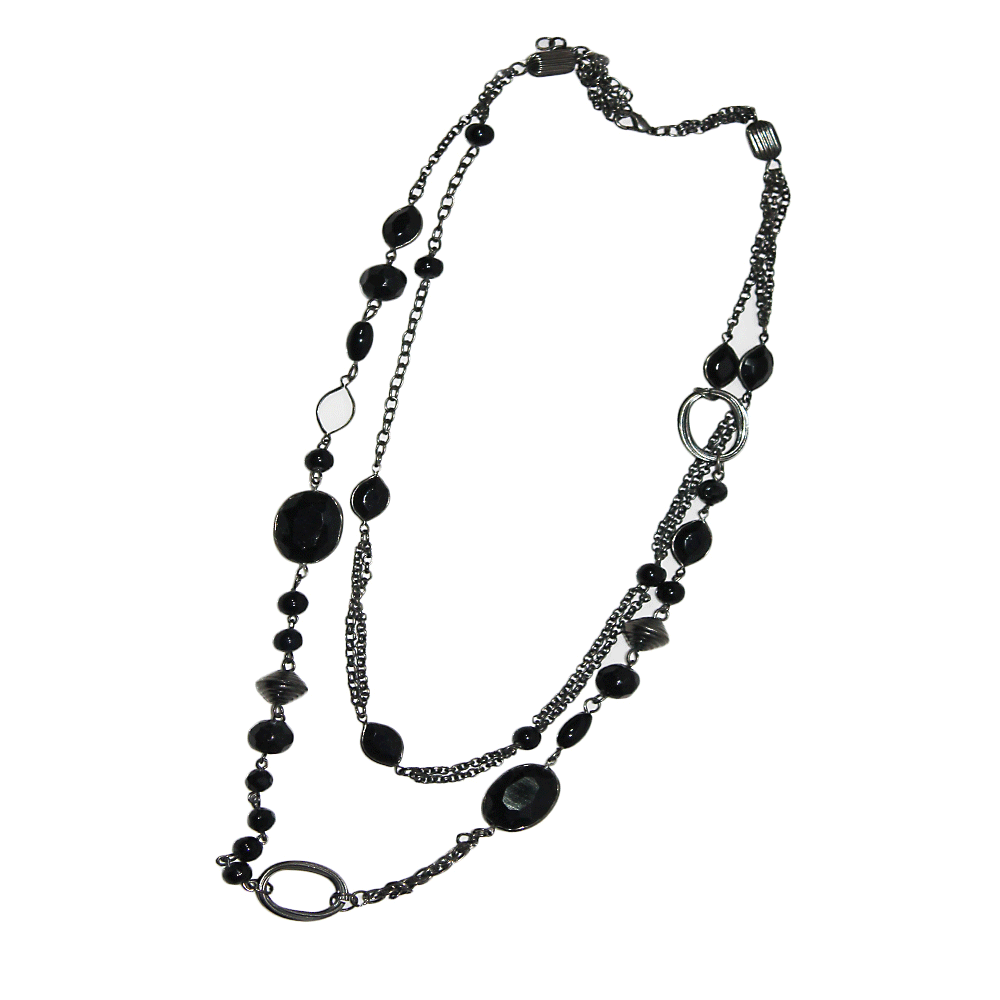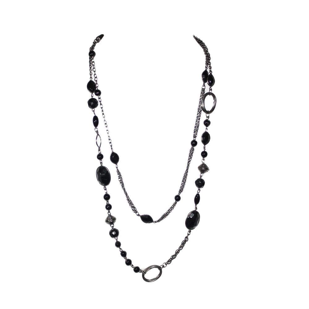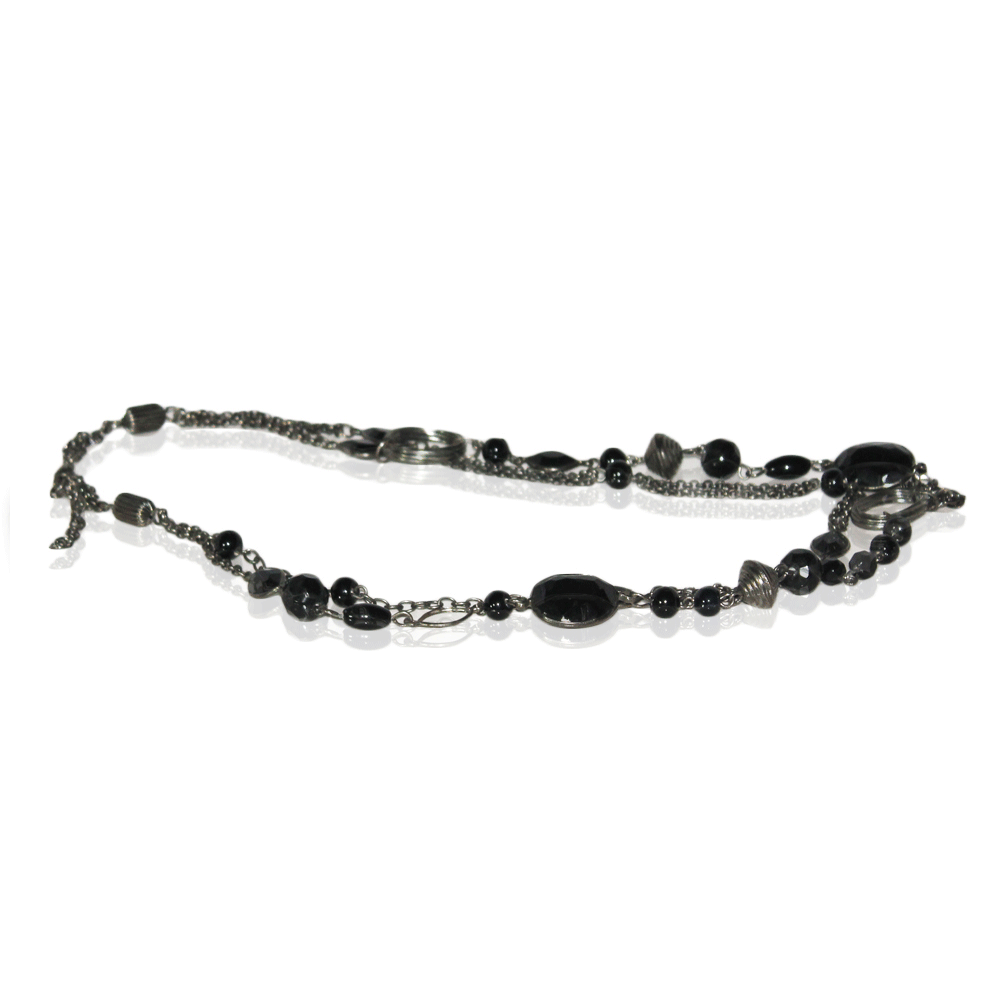 The “Zarood Onux Radiance Necklace” is a classy string of black, glass beads that makes a statement. Made of two chains, one heavily beaded with rings, the other not, this is an accessory you do not want to miss.