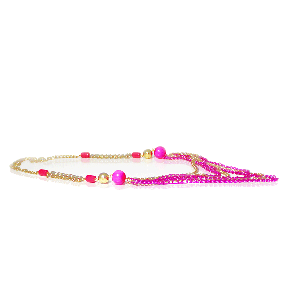 Elegant layered chains of pink and silver with small pink and silver beads that add to the charm of this necklace. This girly, classy piece creates a very feminine yet edgy look. The pink and silver combo is the uniqueness of this necklace