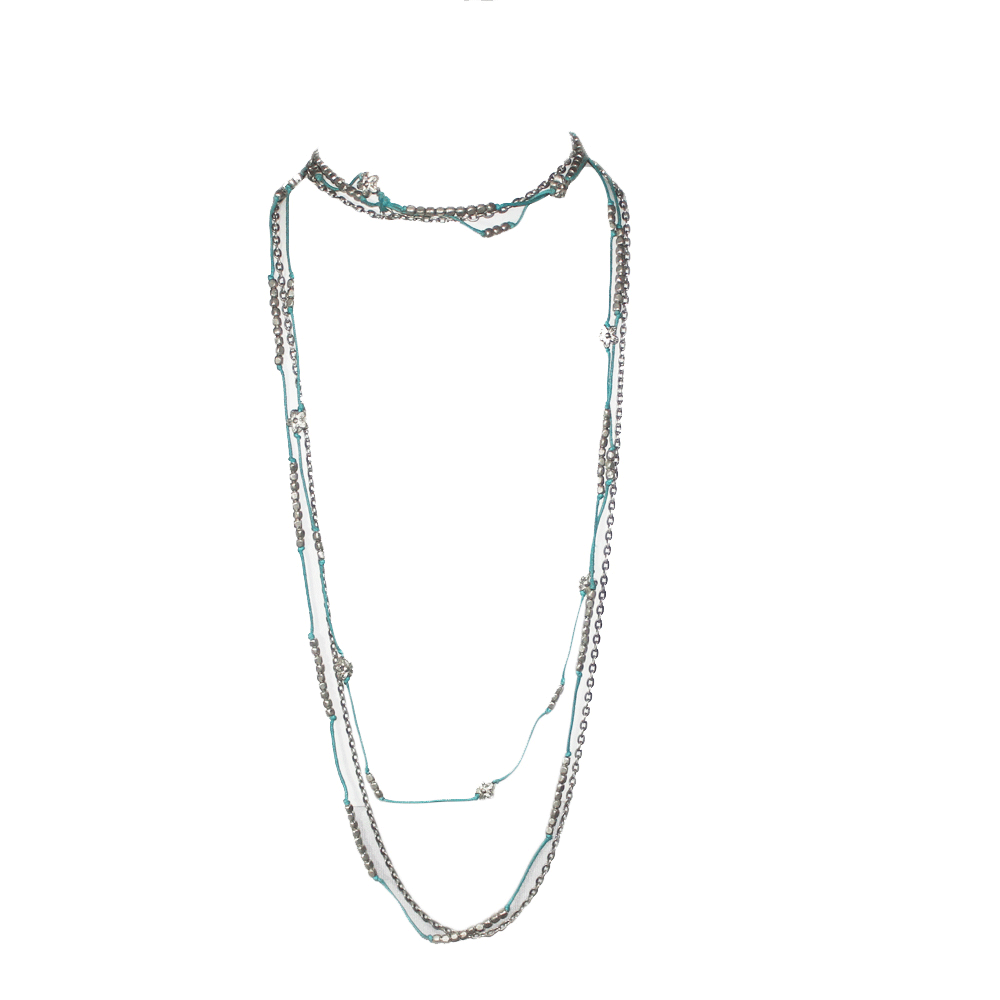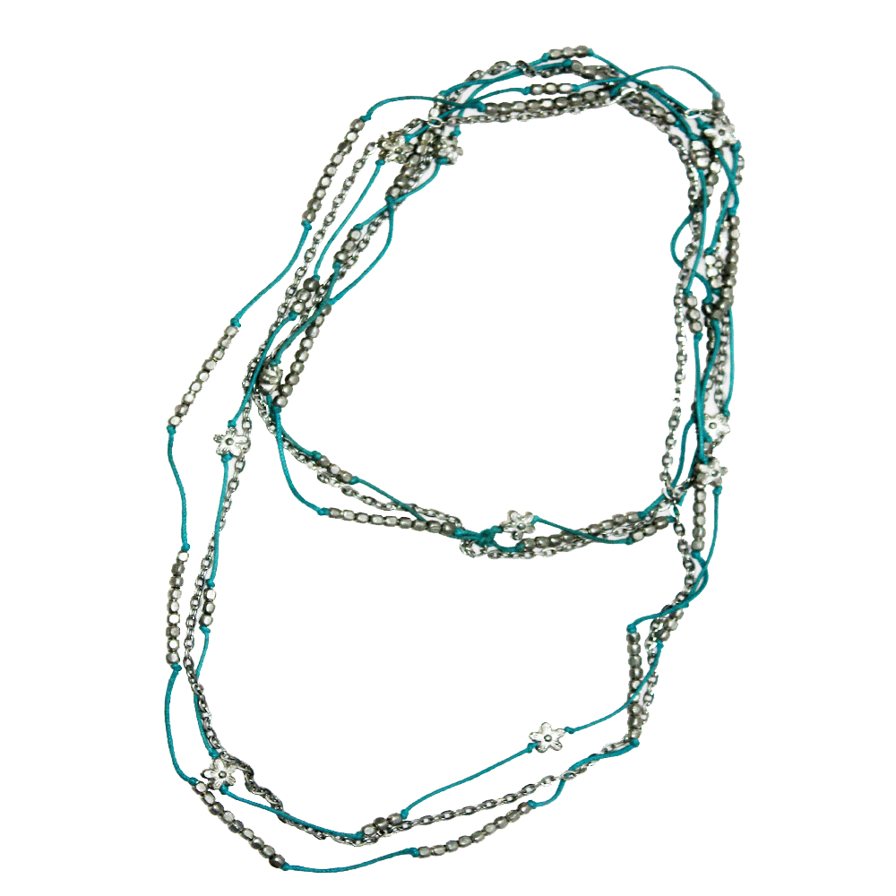 This elegant piece is made of two strands, one is short till the neck and the other is long and dangles below the chest. The necklace is made of three strands of pretty turquoise thread, one with Crystal flowers and the others beaded with small silver stones.