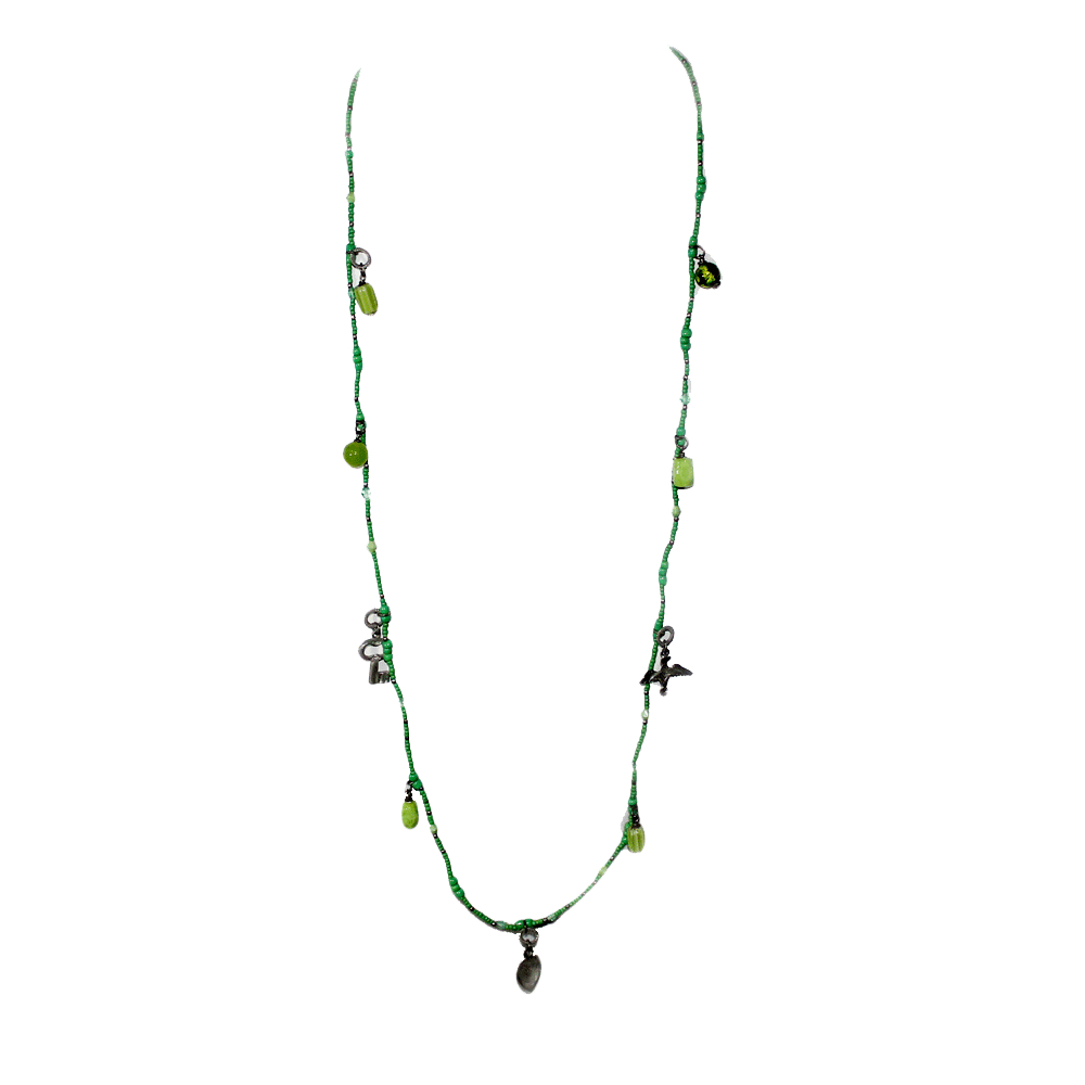 The meaning of vert is green – it signifies hope, joy and sometimes loyalty in love. It also means to turn.  The hues of green in this delicate charm necklace are sure to ‘turn’ heads and make people ‘turn green’ with envy.  The light and carefree design of this handcrafted beauty is a sure winner whenever and wherever you wear it.  The color of nature blends well with anything to dress your-self in. We are sure this petite piece will be so loved, that you would never want to take it off.