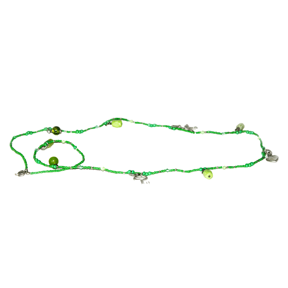 The delicate silver toned chain is dressed up with an assortment of charms that will work like magic to brighten your mood and attire.  So easy on the eyes and the gentle tinkle of the charms will bring a spring to your step making you feel confident and ready to take life head on.  The graceful green hues will uplift your spirit much like the effect nature has on us. Let it hang carelessly over a buttoned up office shirt or dress it up with an elegant ethnic wear. Either way your inherent appeal, of a serious go-getter coupled with a fun lover, will stand out.  This piece lets you experiment and so don’t be afraid to wear it differently – over one shoulder or dangling at the back in an open-back dress.  This piece is trend-setter and an eye-ball grabber. Go ahead girl – treat yourself well!