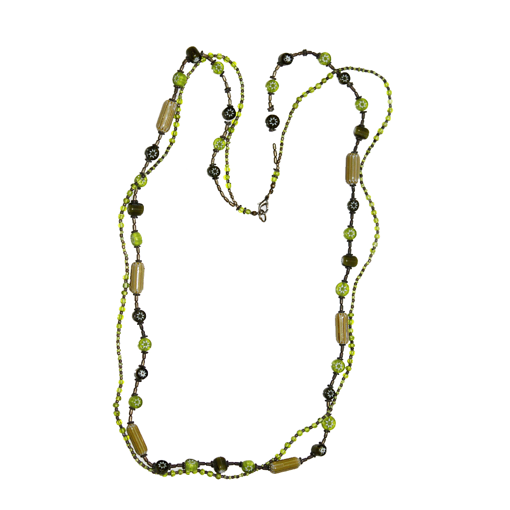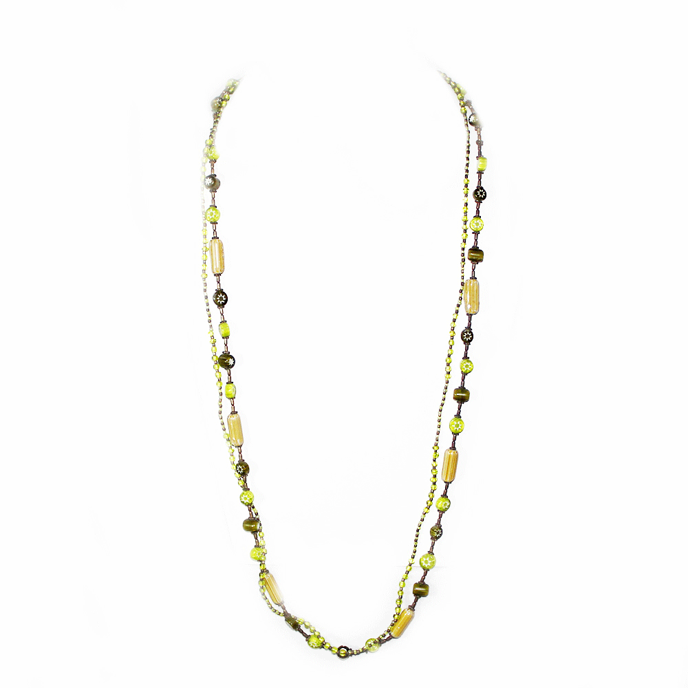 A pretty necklace with lime green, brown and black beads of different shapes and sizes set in a goldish bronze coloured chain. This trendy Neckwear is a must have for everyone.