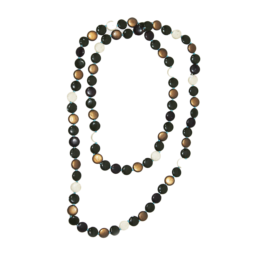 This long tapered necklace adds a touch of nature-inspired beauty to your look with its earthy brown and black beads. The dark tone is interspersed with milky white beads that brighten this piece. This cleverly designed and handcrafted necklace has a rustic touch albeit with a modern twist. That is innovation as a piece of jewelry. Even the length of this piece allows for you to experiment and style it differently.