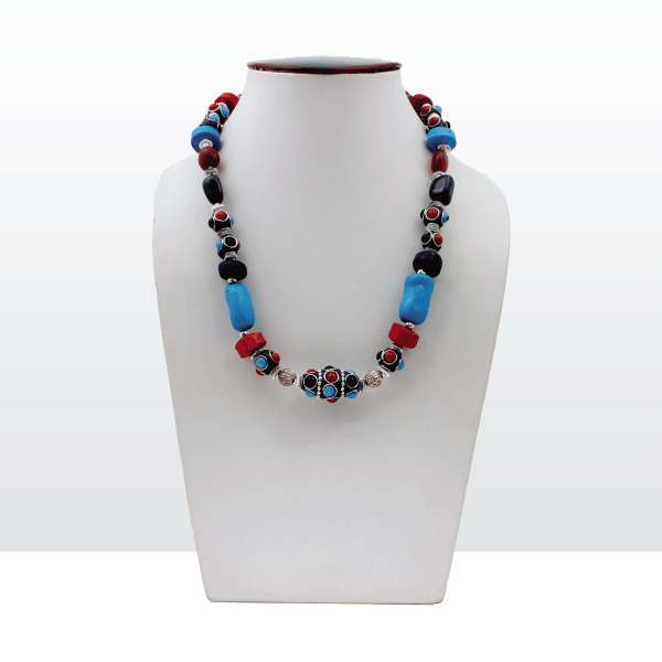 The simple yet intriguing use of burnished stones, ceramic and metal gives it an edgy and trendy feel. The fact that this necklace is non-conforming, sturdy and durable is a dichotomy to the feminine side of you. Isn’t that who you strive to be – every bit a woman, every bit strong! It kind of fits in – any attire, any occasion, anywhere – mix and match with your outfits and let it take over. All you would need to do is take in awe struck expressions and get used to being in the spotlight. It’s a fashion faithful given the whimsical harmony of materials used and the intelligent placing of the stones. Let this necklace be the focal point of your attire – it has a lot going on, on it. Will team best with solid colors – any out of the myriad of colors on this piece!